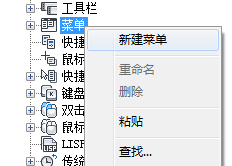 - 在“自定义用户界面”编辑器中“自定义”选项卡上的“<文件名> 中的自定义设置”窗格中,在“菜单”上单击鼠标右键。单击“新建菜单”。