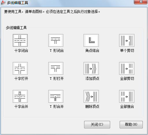 该对话框将显示工具,并以四列显示样例图像。第一列控制交叉的多线,第二列控制 T 形相交的多线,第三列控制角点结合和顶点,第四列控制多线中的打断。