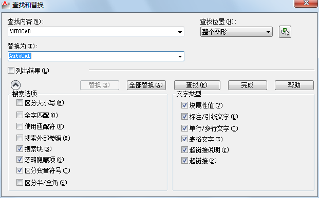 指定是搜索整个图形、当前布局还是搜索当前选定的对象。如果已选择一个对象,则默认值为“所选对象”。如果未选择对象,则默认值为“整个图形”。可以用“选择对象”按钮临时关闭该对话框,并创建或修改选择集。