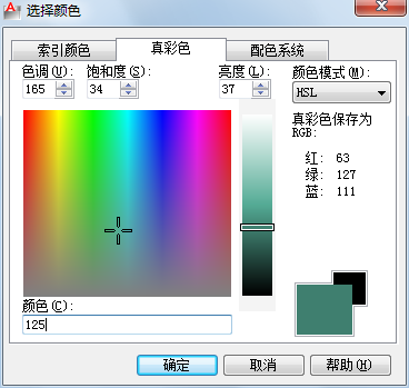 指定使用 RGB 颜色模式来选择颜色。“真彩色”选项卡上的可用选项取决于指定的颜色模式(HSL 或 RGB)。