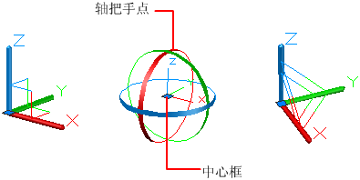 默认情况下,小控件最初置于选择集的中心位置。但是,可以将其重新定位在三维空间中的任意位置。小控件的中心框(或基准夹点)用于设定修改的基点。此行为相当于在用户移动或旋转选定的对象时临时更改 UCS 的位置。小控件上的轴控制柄将移动或旋转约束到轴或平面上。