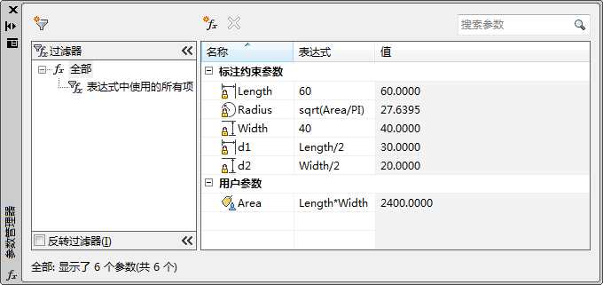 长度和宽度标注约束参数设定为常量。d1 和 d2 约束为参照长度和宽度的简单表达式。半径标注约束参数设定为包含平方根函数的表达式,用括号括起以确定操作的优先级顺序、Area 用户变量、除法运算符以及常量 PI。这些参数均显示在参数管理器中。